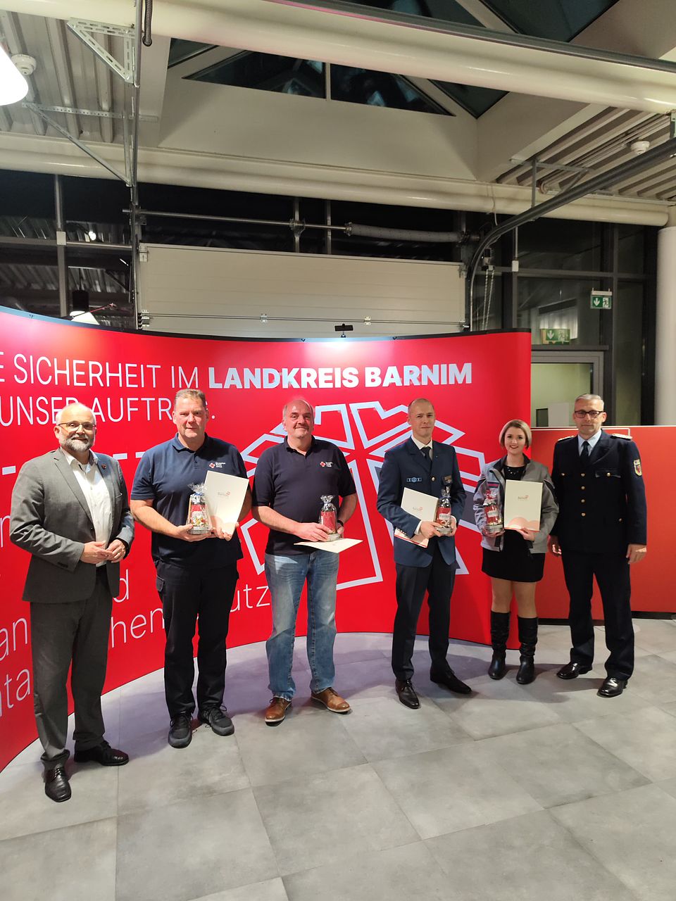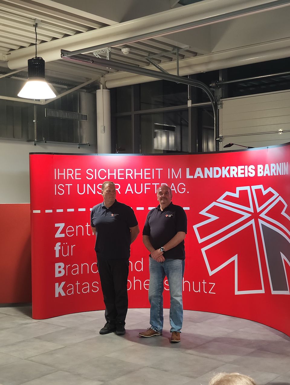Bei der Auszeichnungsveranstaltung am 7. November 2025 im Zentrum für Brand- und Katastrophenschutz des Landkreises Barnim ehrte Landrat Daniel Kurth die langjährigenVerdienste von Kameradinnen und Kameraden der Freiwilligen Feuerwehren sowie Angehörigen der Hilfsorganisationen. Geehrt wurden unter anderem Lars Thom und Axel Hoffmann von der DRK-Bereitschaft Eberswalde für 10 Jahre treue Dienste. Insgesamt wurden Auszeichnungen für bis zu 80 Jahre ehrenamtliches Engagement verliehen.